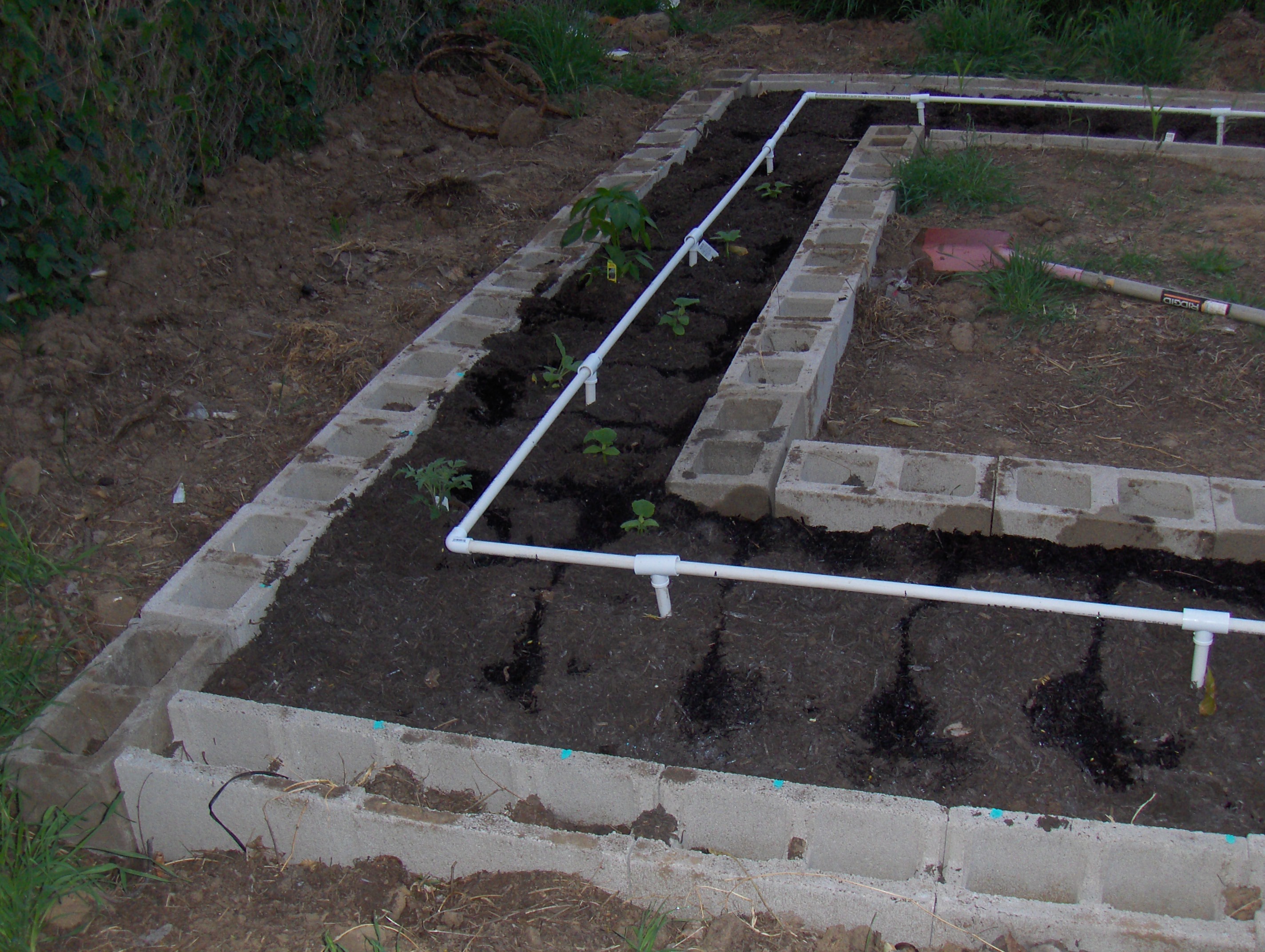 Shown in this picture are the little baby cucumber plants to the right of the pipe; a tall, healthy bell